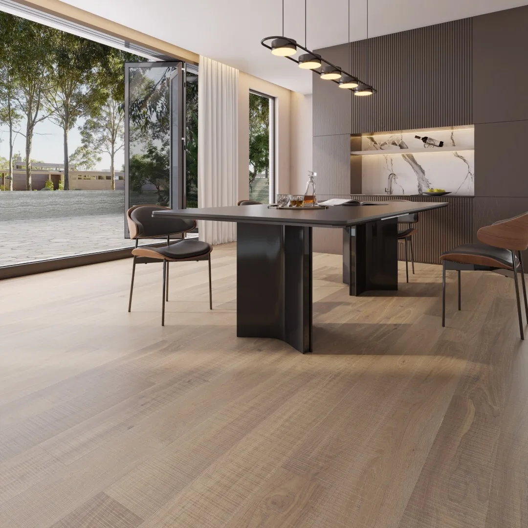The sawn texture accentuates the natural grain patterns, while the smoked finish adds a deeper, more refined tone. Designed for durability and everyday use, this flooring is ideal for both residential interiors and commercial environments seeking a unique wood finish.