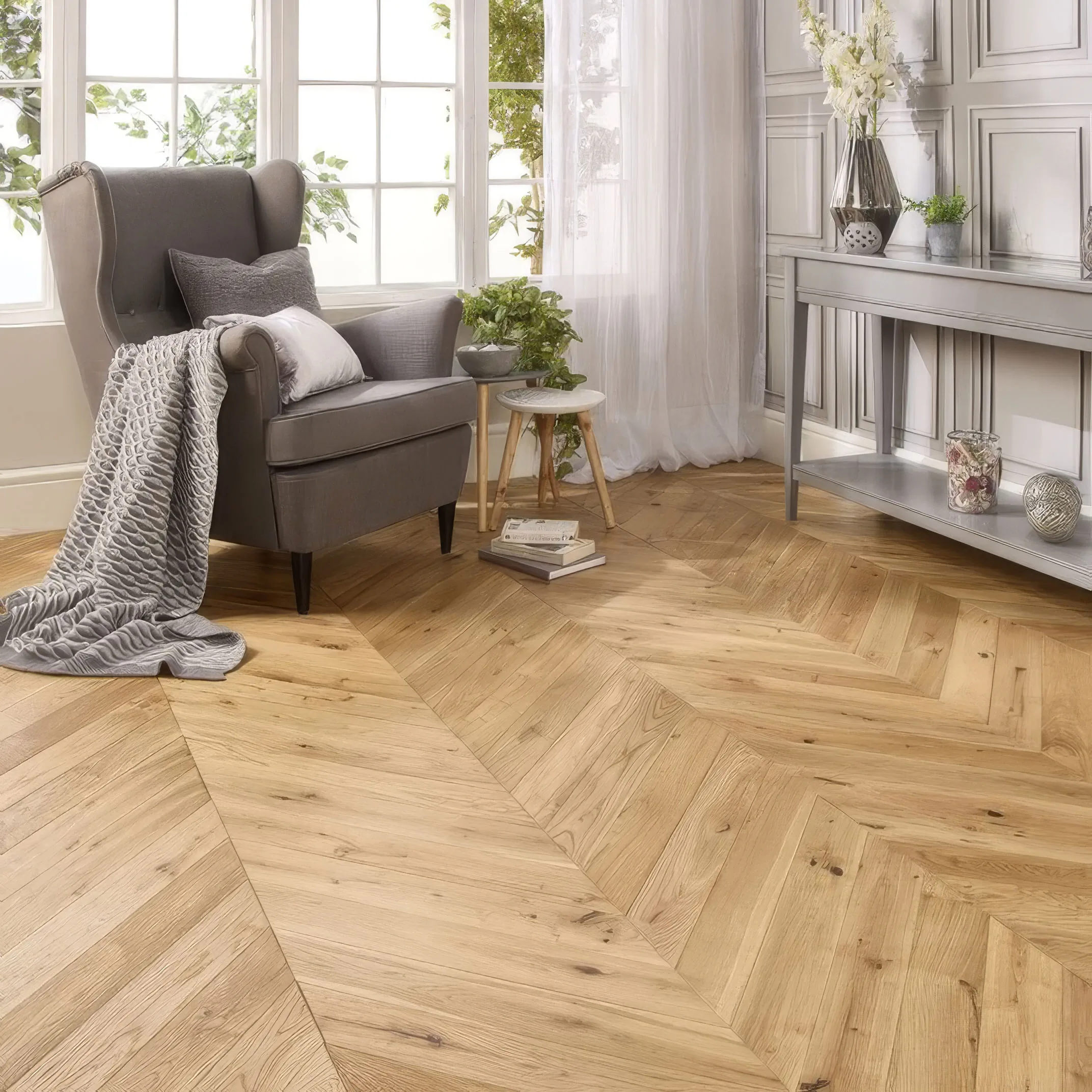 Chevron flooring is ideal for those looking to make a bold and unique statement in both residential and commercial spaces. Solid Wood Flooring showcases the inherent beauty and grain of the wood, adding a warm and timeless elegance to any space. The solid wood construction allows for multiple sanding and refinishing over its lifetime, maintaining its stunning appearance and functionality for years to come.